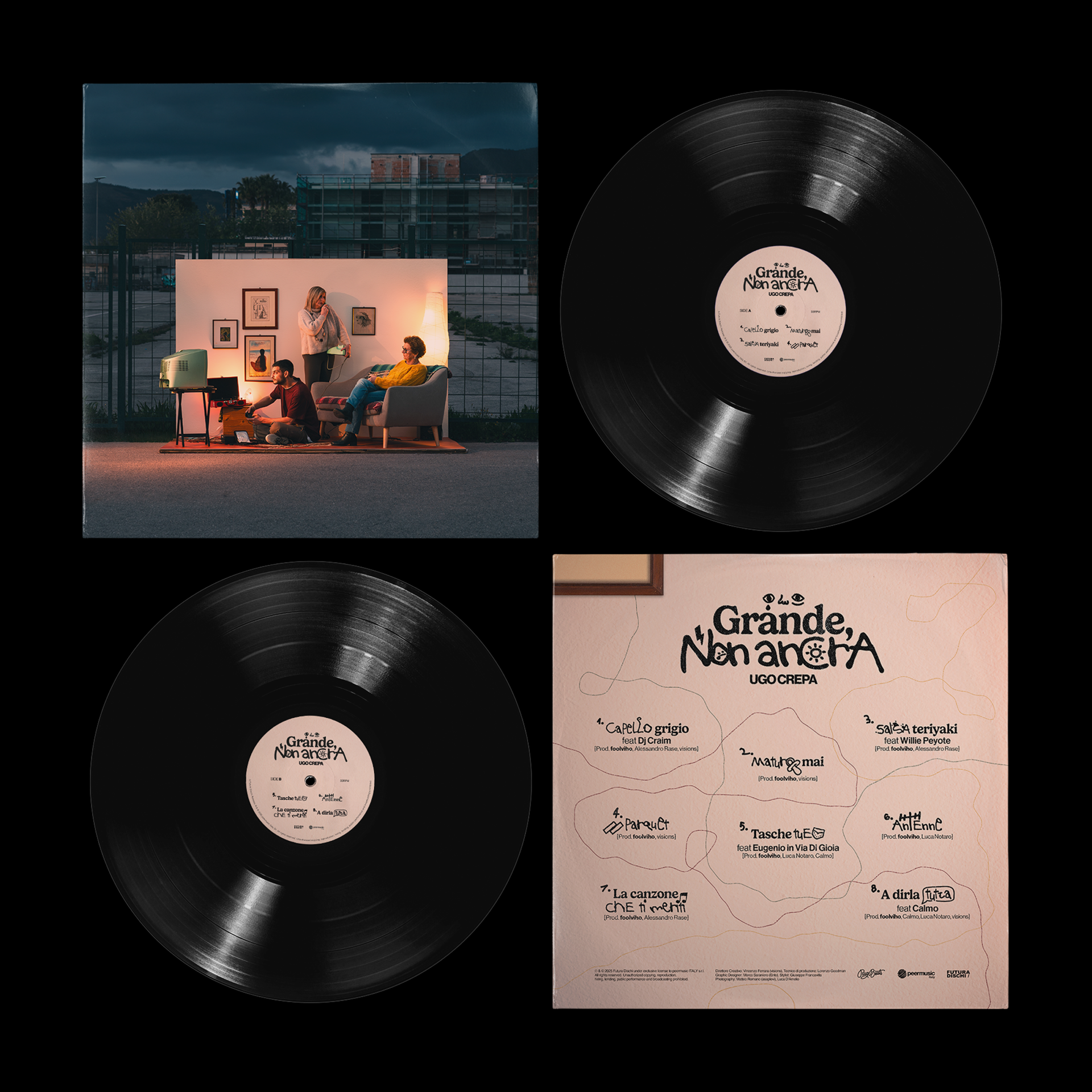 For the project “Grande non ancora” by Ugo Crepa, I was responsible for the overall graphic design, developing the tracklist layout and design, the title design, the vinyl packaging, and the communication assets. The goal was to visually translate the album’s narrative and musical identity into a coherent and recognizable graphic language. The process was carried out in close collaboration with a team handling the photography and video production, ensuring a consistent dialogue between imagery, music, and design for an integrated and harmonious visual communication across all channels.